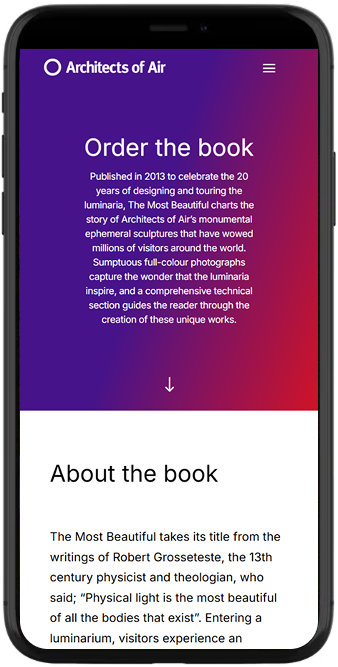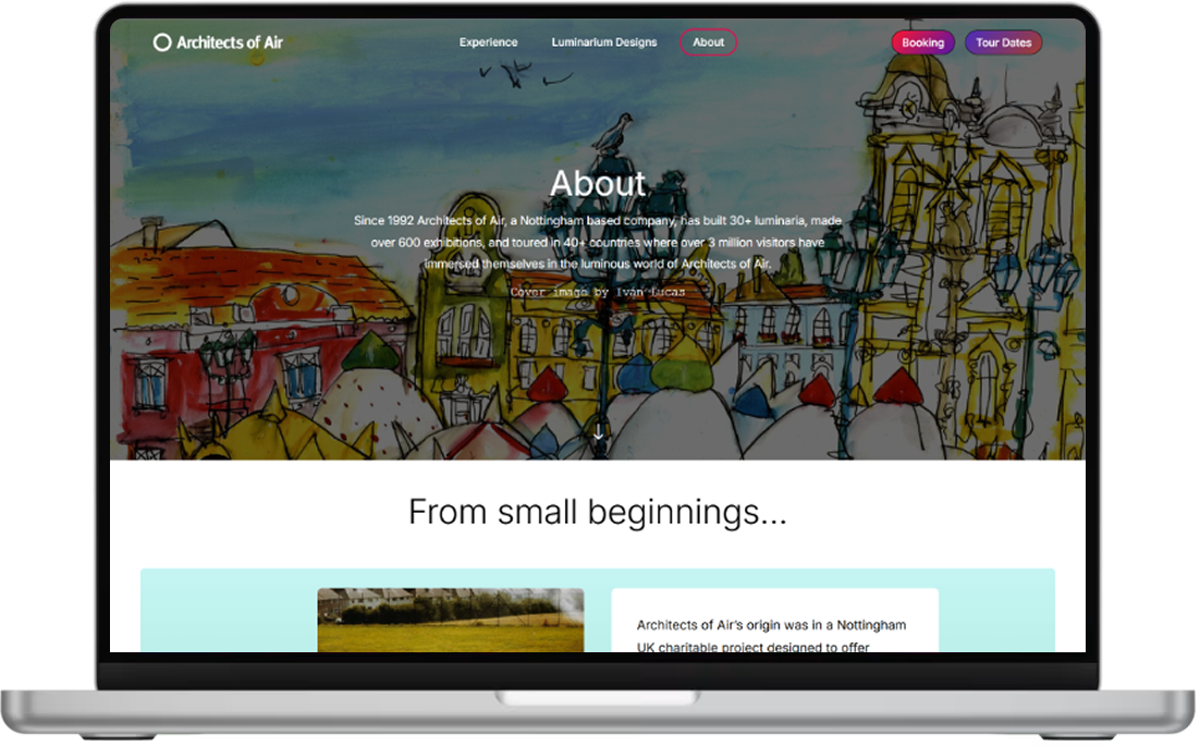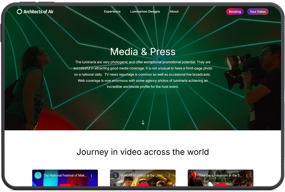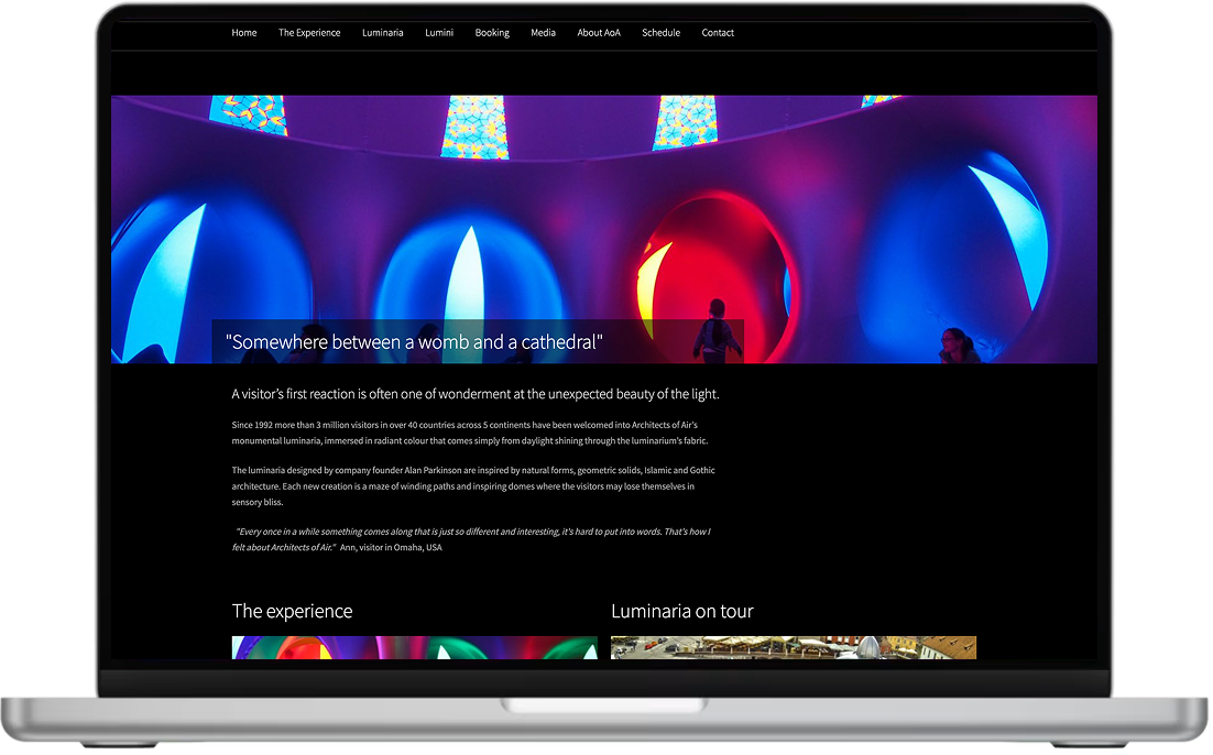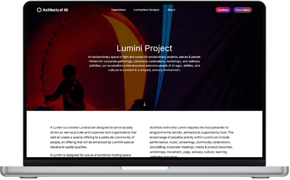 Conveying with digital magic the wonder of the Luminaria for first-time visitors. A bespoke WordPress-hosted creation. Blending art and architecture through an action-oriented and information-rich user flow.