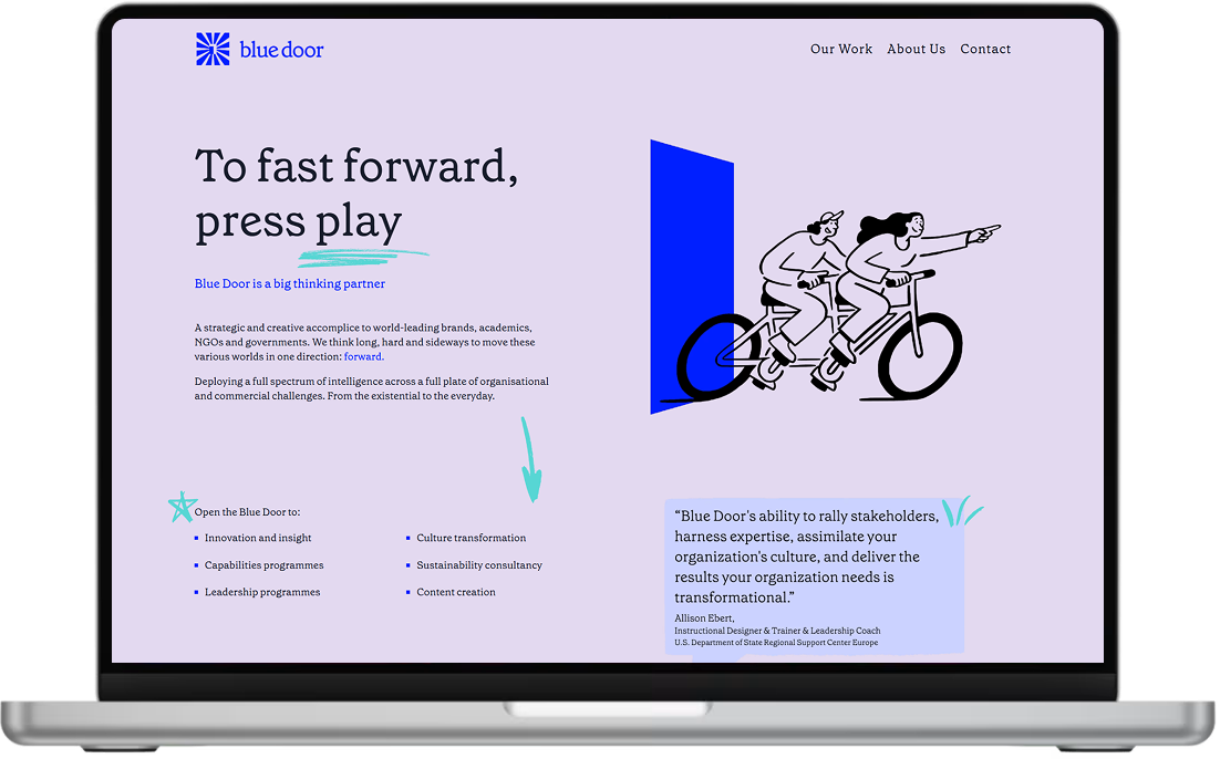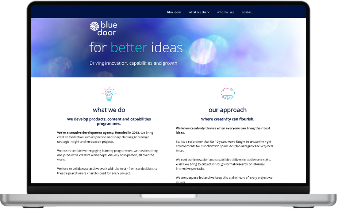 Blue Door’s legacy website was out of kilter with their dynamic style and global-reaching excellence. It simply didn’t do justice to the fresh and deep thinking that defines their consulting services.