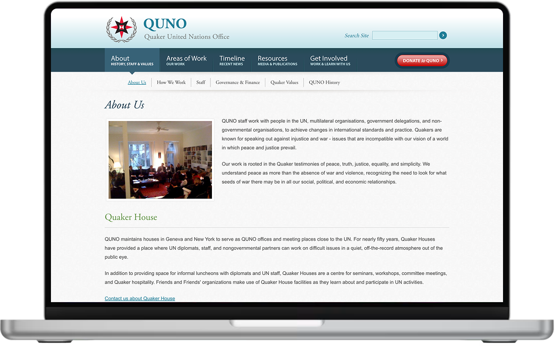To leverage our website redesign services to amplify QUNO’s voice within the international community, celebrate its rich legacy, and help build informed coalitions for peace and justice.